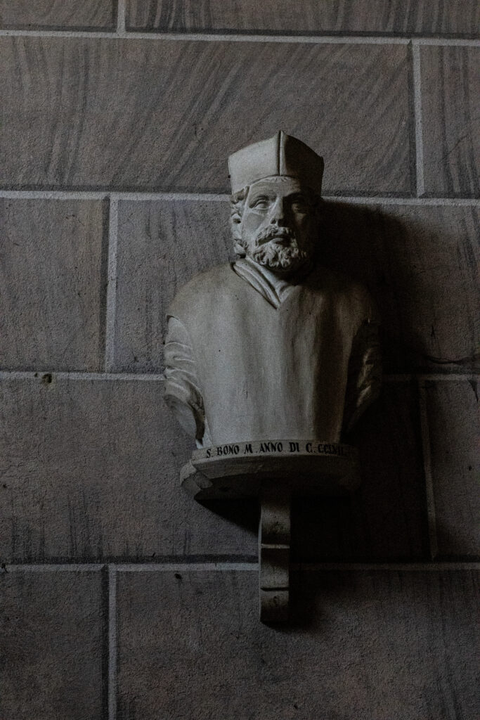 C’è un custode davvero insolito e particolare in questo luogo: è San Bono che, con uno sguardo attento e vigile, ci osserva mentre entriamo silenziosamente, facendo appena rumore, passando dalla piccola e raccolta chiesina. Quell’angolo di preghiera, così intimo e suggestivo, un tempo era la cappella riservata alle monache benedettine che, in epoca più recente, hanno abitato e vissuto tra le stanze della dimora storica nota e chiamata “Villa San Bono”, proprio in onore del santo a cui è dedicata.